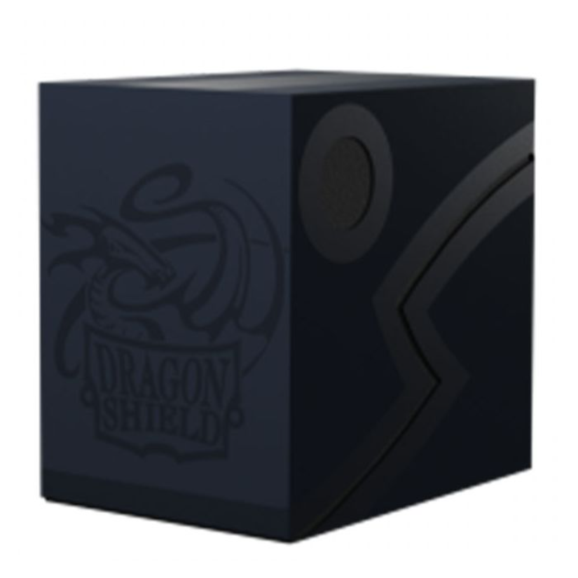 Midnight blue exterior with a black interior. The perfect commander deck box! The Dragon Shield Double Shell is a sturdy deck box with two layers of protection all the way around. The lid wraps around the box for a secure closure or can be set to stay open for easy access to cards. Cube Shells will fit inside. The Double Shell fits inside large Nest boxes and Magic Carpets. Each Double Shell has a writing field on top for personalization and comes with a divider. The Double Shell holds up to 150 single sleeved cards or 120 double-sleeved cards or 100 Sealable double-sleeved cards.