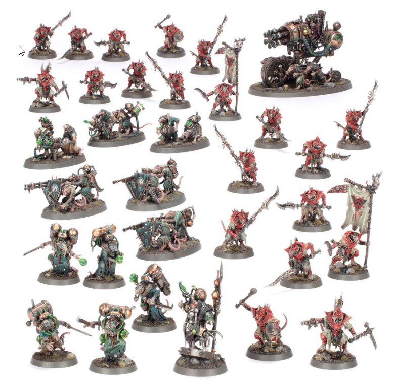 This packed boxed set is ideal for starting a new Skaven collection – or expanding an existing army – to unleash in games of Warhammer Age of Sigmar, and save money compared to buying the kits separately. The army is led by a devious Arch-Warlock and supported by the overwhelming firepower of a savage Ratling Warpblaster. You'll also find a unit of Warplock Jezzails, Acolyte Globadiers, and a Warpspark Weapon Battery armed with Warpvolt Scourgers, Ratling Guns, or Warpfire Throwers. Ensuring board control, there's also a large contingent of elite Stormvermin to deal with anyone who gets too close, and for taking and holding objectives.