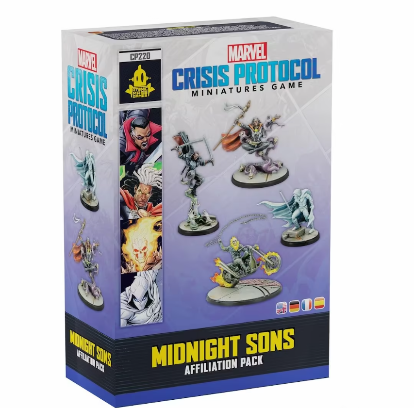 The Midnight Sons Affiliation Pack recruits the champions of darkness from across the Marvel Universe to face off against any shadowy foe. With Blade, Moon Knight, Ghost Rider, and Doctor Voodoo, these characters are joined together in this repackaged Affiliation Pack.