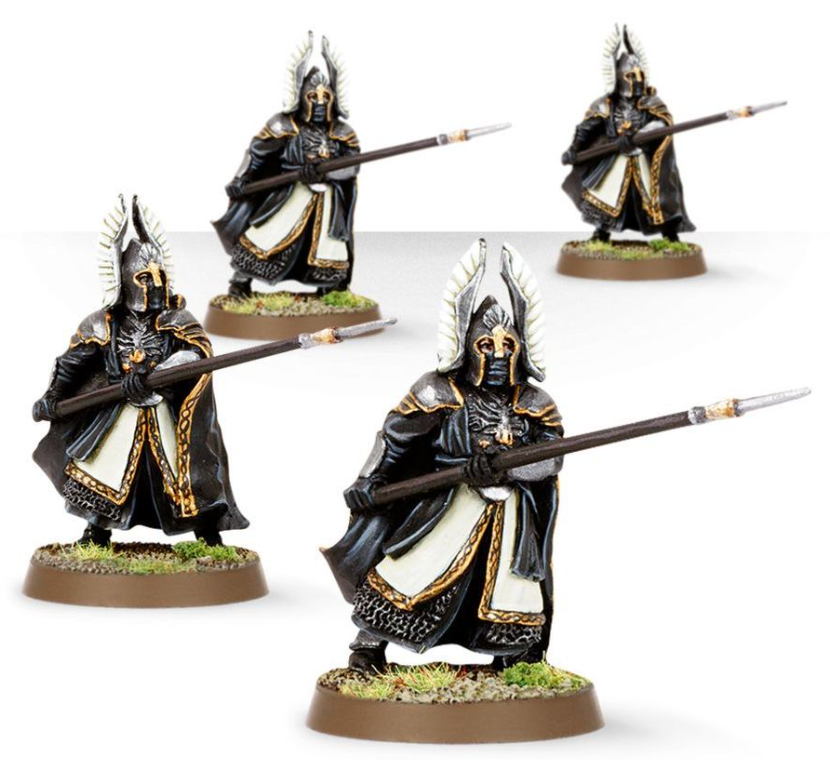 The Guard of the Fountain Court are selected from the most disciplined of veterans in all of Gondor, swearing to give their lives in service to the lords of Minas Tirith. Too few in number to form their own regiments upon the battlefield Fountain Court Guards instead act as body guards and commanders shoring up weaknesses in Gondor's defences through their unfailing example.
